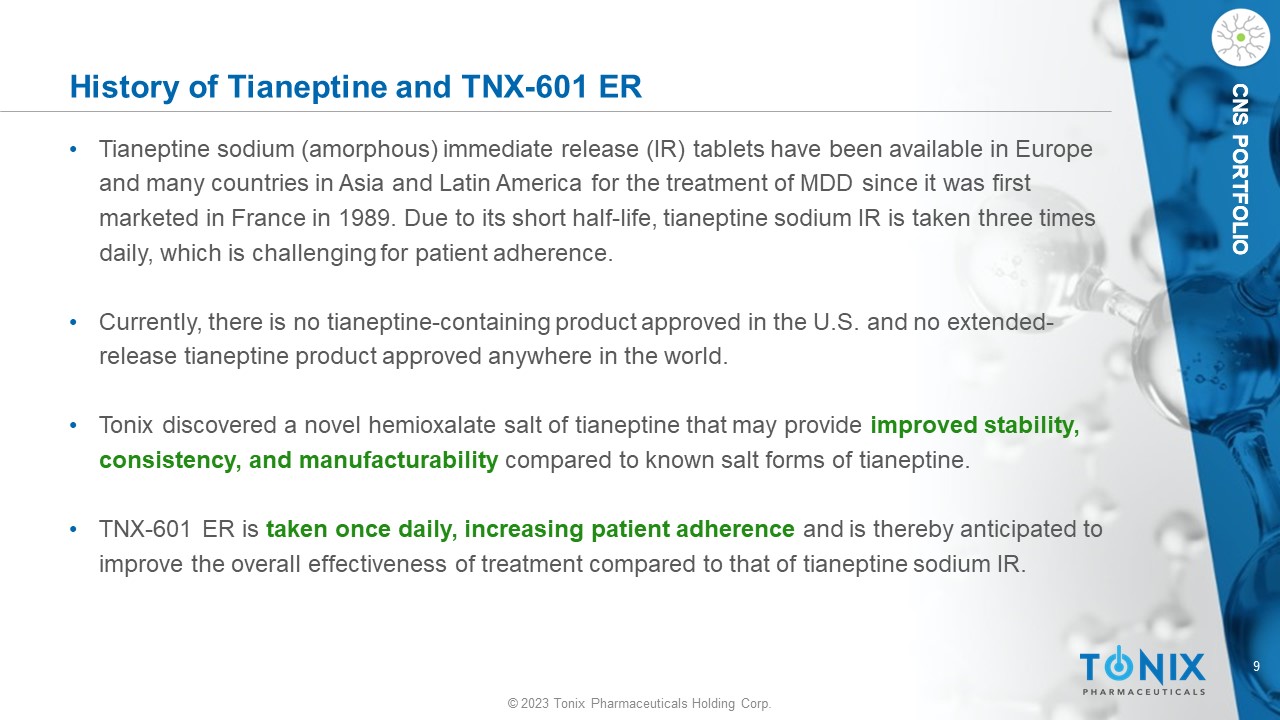 © 2023 Tonix Pharmaceuticals Holding Corp. 9 © 2023 Tonix Pharmaceuticals Holding Corp. CNS PORTFOLIO History of Tianeptine and TNX - 601 ER CNS PORTFOLIO • Tianeptine sodium (amorphous) immediate release (IR) tablets have been available in Europe and many countries in Asia and Latin America for the treatment of MDD since it was first marketed in France in 1989. Due to its short half - life, tianeptine sodium IR is taken three times daily, which is challenging for patient adherence. • Currently, there is no tianeptine - containing product approved in the U.S. and no extended - release tianeptine product approved anywhere in the world. • Tonix discovered a novel hemioxalate salt of tianeptine that may provide improved stability, consistency, and manufacturability compared to known salt forms of tianeptine. • TNX - 601 ER is taken once daily, increasing patient adherence and is thereby anticipated to improve the overall effectiveness of treatment compared to that of tianeptine sodium IR.