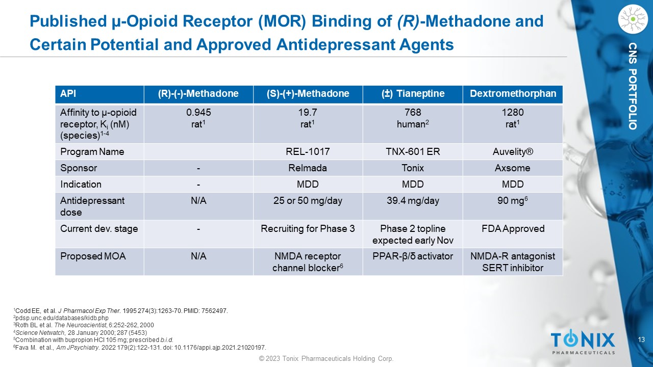 © 2023 Tonix Pharmaceuticals Holding Corp. 13 © 2023 Tonix Pharmaceuticals Holding Corp. CNS PORTFOLIO Published µ - Opioid Receptor (MOR) Binding of (R) - Methadone and Certain Potential and Approved Antidepressant Agents 1 Codd EE, et al. J Pharmacol Exp Ther . 1995 274(3):1263 - 70. PMID: 7562497. 2 pdsp.unc.edu/databases/ kidb.php 3 Roth BL et al. The Neuroscientist , 6:252 - 262, 2000 4 Science Netwatch , 28 January 2000; 287 (5453) 5 Combination with bupropion HCl 105 mg; prescribed b.i.d. 6 Fava M. et al., Am JPsychiatry . 2022 179(2):122 - 131. doi : 10.1176/appi.ajp.2021.21020197. Dextromethorphan ( ± ) Tianeptine (S) - (+) - Methadone (R) - ( - ) - Methadone API 1280 rat 1 768 human 2 19.7 rat 1 0.945 rat 1 Affinity to µ - opioid receptor, K i ( nM ) (species) 1 - 4 Auvelity ® TNX - 601 ER REL - 1017 Program Name Axsome Tonix Relmada - Sponsor MDD MDD MDD - Indication 90 mg 6 39.4 mg/day 25 or 50 mg/day N/A Antidepressant dose FDA Approved Phase 2 topline expected early Nov Recruiting for Phase 3 - Current dev. stage NMDA - R antagonist SERT inhibitor PPAR - β/δ activator NMDA receptor channel blocker 6 N/A Proposed MOA