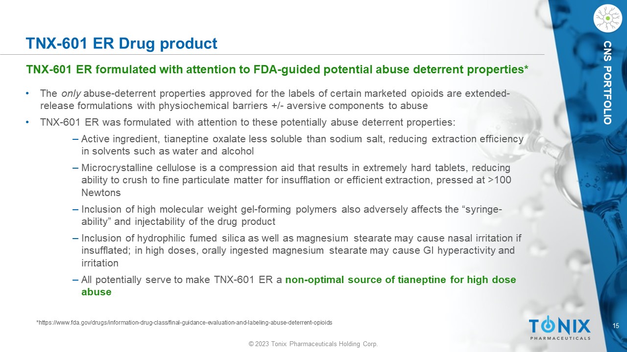 © 2023 Tonix Pharmaceuticals Holding Corp. 14 © 2023 Tonix Pharmaceuticals Holding Corp. CNS PORTFOLIO Prescription Tianeptine has Low Incidence of Abuse • Tianeptine and its MC5 metabolite are weak opioid (µ - opioid) receptor (MOR) agonists 1 that present a potential abuse liability if illicitly misused in large quantities ‒ Typically abused at 8 - 80 times the therapeutic dose on a daily basis 2 . • Post - marketing research in France showed that in patients who were prescribed tianeptine for depression, the incidence of misuse was approximately 1 case per 1,000 patients treated 3 ‒ Suggests low abuse liability when used at the antidepressant dose • Clinical trials have shown that abrupt cessation of a therapeutic course of tianeptine does not result in dependence or withdrawal symptoms following a treat ment duration of : ‒ 6 - weeks 4 - 8 ‒ 3 - months 9 ‒ 12 - months 10 Low activity at µ - opioid receptor is associated with low misuse of prescription oral tianeptine 1 Gassaway et al., 2014. Transl Psychiatry . 4(7):e411 2 Lauhan et al., 2018. Psychosomatics. 59(6), 547 – 53 3 Haute Authorite de Sante. Transparency Committee Opinion. Stablon 12.5 Mg, Coated Tablet, Re - Assessment of Actual Benefit at the Request of the Transparency Committee. December 5, 2012. 4 Emsley et al., 2018. J. Clin. Psychiatry . 79 (4) 5 Bonierbale et al., 2003. Curr Med Res Opin . 19(2):114 - 124 6 Guelfi et al., 1989. Neuropsychobiology . 22 (1), 41 – 48 7 Invernizzi et al., 1994. Neuropsychobiology . 30 (2 – 3), 85 – 93 8 Lepine et al., 2001. Hum. Psychopharmacol . 16 (3), 219 – 227 9 Guelfi et al., 1992. Neuropsychobiology . 25 (3), 140 – 148. 10 Lôo et al., 1992. Br. J. Psychiatry. Suppl. No. 15, 61 – 65.