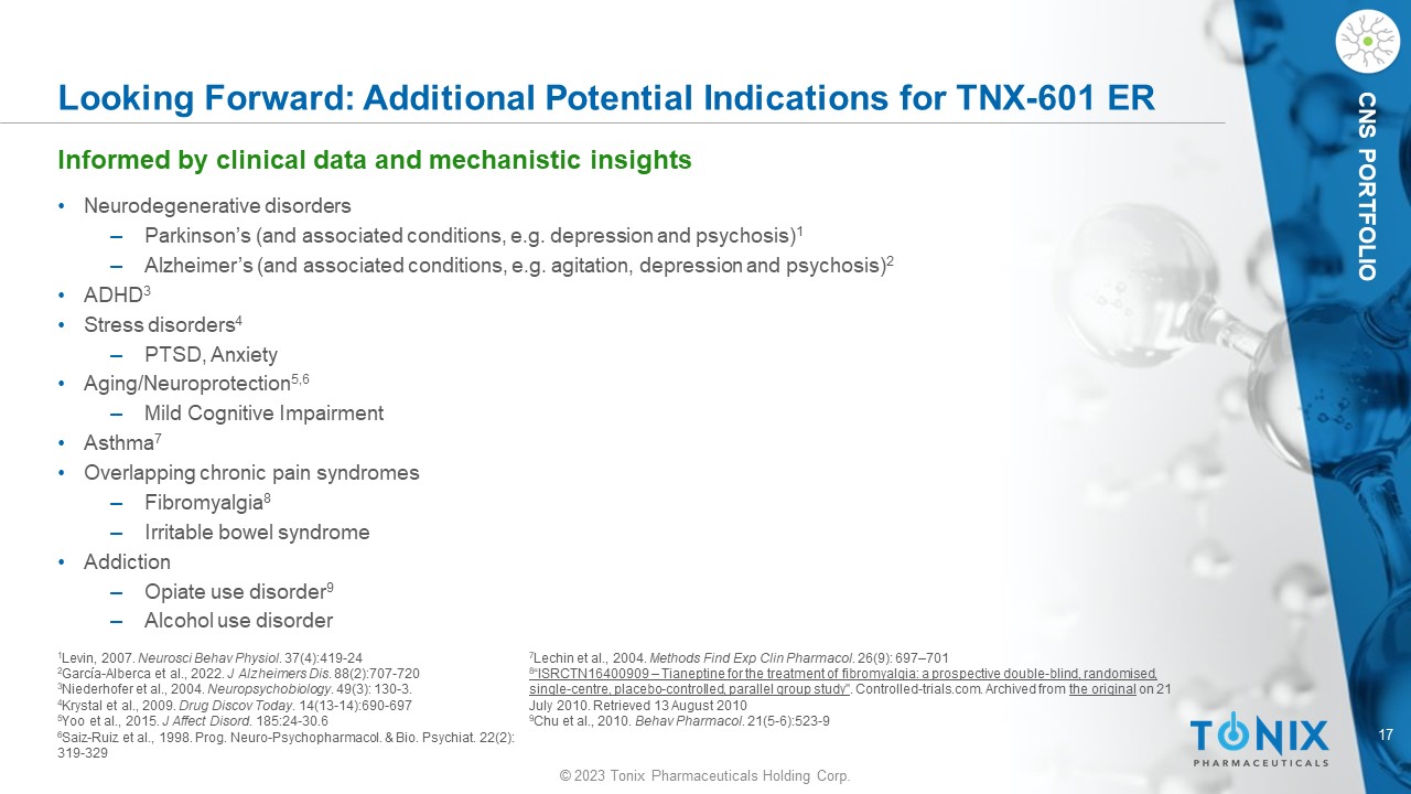 © 2023 Tonix Pharmaceuticals Holding Corp. 16 © 2023 Tonix Pharmaceuticals Holding Corp. CNS PORTFOLIO Summary: TNX - 601 ER vs. Other Antidepressants • Given tianeptine’s unique metabolic pathway, which is independent of the hepatic P450 system, it is anticipated that, like tianeptine sodium, TNX - 601 ER will have a reduced risk of drug - drug interactions compared to most antidepressants • Unique mechanism of action (MOA) compared to available antidepressants in the U.S. • The efficacy of tianeptine sodium IR is comparable to both selective serotonin reuptake inhibitor (SSRI) and tricyclic antidepressants 1,2 while being associated with a low incidence of sexual dysfunction compared with either of those classes 3 , and no associated derangement of sleep architecture, sedative effects, weight gain, or cognitive impairment 1 • Once - daily dosing regimen compared to tianeptine sodium IR at three times a day 1 Wagstaff et al., 2001. CNS Drugs . 15(3), 231 – 259 2 Kasper et al., 2002. Eur Psychiatry. 17 (Suppl 3), 331 - 340 3 Bonierbale et al., 2003. Curr Med Res Opin . 19(2):114 - 124