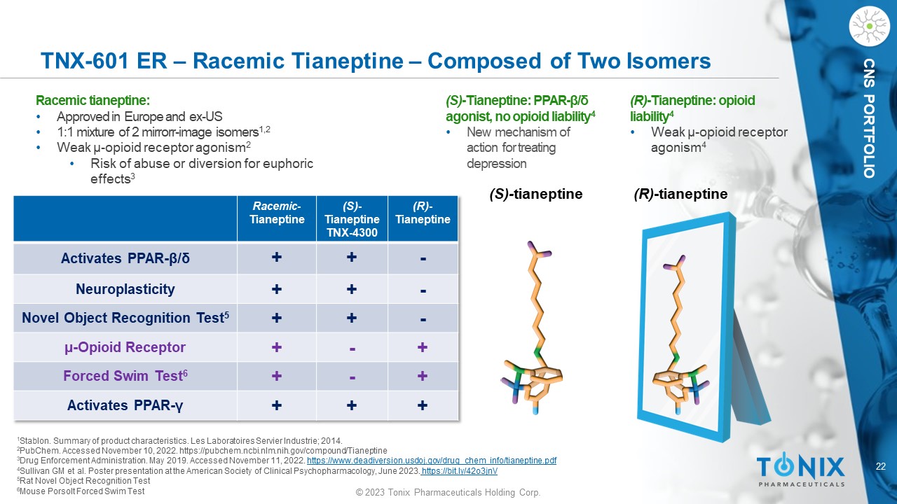 © 2023 Tonix Pharmaceuticals Holding Corp. 22 © 2023 Tonix Pharmaceuticals Holding Corp. CNS PORTFOLIO TNX - 601 ER – Racemic Tianeptine – Composed of Two Isomers Racemic tianeptine : • Approved in Europe and ex - US • 1:1 mixture of 2 mirrorr - image isomers 1,2 • Weak µ - o pioid receptor agonism 2 • Risk of abuse or diversion for euphoric effects 3 (S) - t ianeptine (R) - tianeptine 1 Stablon. Summary of product characteristics. Les Laboratoires Servier Industrie ; 2014. 2 PubChem. Accessed November 10, 2022. https://pubchem.ncbi.nlm.nih.gov/compound/Tianeptine 3 Drug Enforcement Administration. May 2019. Accessed November 11, 2022 . https://www.deadiversion.usdoj.gov/drug_chem_info/tianeptine.pdf 4 Sullivan GM et al. Poster presentation at the American Society of Clinical Psychopharmacology, June 2023 . https://bit.ly/42o3jnV 5 Rat Novel Object Recognition Test 6 Mouse Porsolt Forced Swim Test (R) - Tianeptine (S) - Tianeptine TNX - 4300 Racemic - Tianeptine - + + Activates PPAR - β / δ - + + Neuroplasticity - + + Novel Object Recognition Test 5 + - + µ - Opioid Receptor + - + Forced Swim Test 6 + + + Activates PPAR - γ (S) - Tianeptine: PPAR - β / δ agonist, no opioid liability 4 • New mechanism of action for treating depression (R) - Tianeptine: opioid liability 4 • Weak µ - o pioid receptor agonism 4