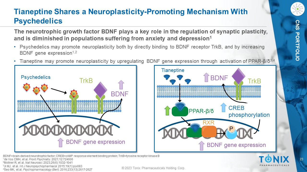 © 2023 Tonix Pharmaceuticals Holding Corp. 23 © 2023 Tonix Pharmaceuticals Holding Corp. CNS PORTFOLIO The n eurotrophic growth factor BDNF plays a key role in the regulation of synaptic plasticity, and is diminished in populations suffering from anxiety and depression 1 • Psychedelics may promote neuroplasticity both by directly binding to BDNF receptor TrkB , and by increasing BDNF gene expression 1,2 • Tianeptine may promote neuroplasticity by upregulating BDNF gene expression through activation of PPAR - β/δ 3,4 Tianeptine Shares a Neuroplasticity - Promoting Mechanism With Psychedelics BDNF=brain - derived neurotrophic factor; CREB=cAMP response element binding protein; TrkB =tyrosine receptor kinase B 1 de Vos CMH, et al. Front Psychiatry . 2021;12:724606 2 Moliner R, et al. Nat Neurosci . 2023;26(6):1032 - 1041 3 Ji MJ, et al. Int J Neuropsychopharmacol . 2015;19(1):pyv083 4 Seo MK, et al. Psychopharmacology ( Berl ) . 2016;233(13):2617 - 2627 Tianeptine PPAR - β/δ RXR P BDNF BDNF gene expression CREB phosphorylation TrkB Psychedelics BDNF BDNF gene expression TrkB
