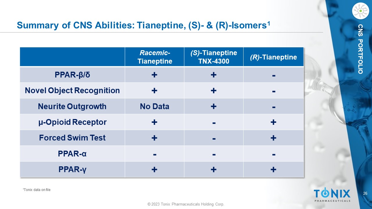© 2023 Tonix Pharmaceuticals Holding Corp. 25 © 2023 Tonix Pharmaceuticals Holding Corp. CNS PORTFOLIO (R) - Tianeptine, but not (S) - Tianeptine Reduces Immobility in Murine Forced Swim Test (FST) 1 (S) - Tianeptine Study (R) - Tianeptine Study Racemic Tianeptine in FST Similar Acute Effects Reported by Samuels & Co - Workers 2 • Samuels et al found no effect of tianeptine on FST activity in µ – opioid receptor KO mouse or in mice pretreated with opioid anta gonists, indicating behavioral effect was µ – opioid mediated • Their murine PK studies demonstrated tianeptine rapidly metabolized and nearly eliminated from murine plasma and brain after 1 h our (the time after tianeptine their FST was performed); whereas MC5 metabolite detectable for at least 8 hours • Authors suggest MC5 is expected to play a major role in mediating the behavioral effects on FST in mice ( S ) - Tianeptine not active in FST, ( R ) - Tianeptine is active 1 Tonix poster presented at ASCP 2023 Annual Meeting, Miami FL, May 30 - June 2, Poster T41 2 Samuels et al., 2017. Neuropsychopharmacology . 42(10):2052 - 2063 ***p<0.001 and ****p<0.0001 compared to vehicle in both figures
