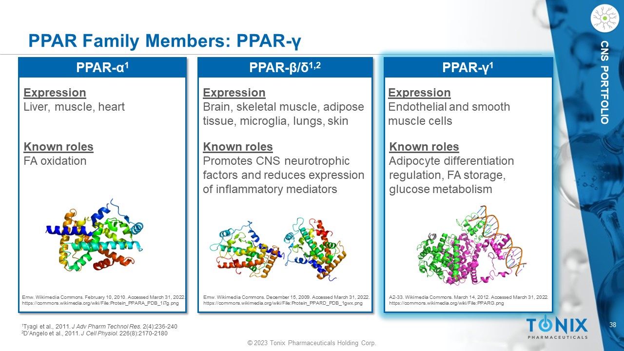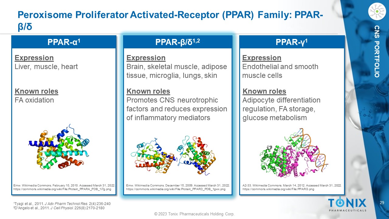 © 2023 Tonix Pharmaceuticals Holding Corp. 38 © 2023 Tonix Pharmaceuticals Holding Corp. CNS PORTFOLIO PPAR Family Members: PPAR - γ Emw . Wikimedia Commons . February 10, 2010. Accessed March 31, 2022. https://commons.wikimedia.org/wiki/File:Protein_PPARA_PDB_1i7g.png Emw . Wikimedia Commons . December 15, 2009. Accessed March 31, 2022. https://commons.wikimedia.org/wiki/File:Protein_PPARD_PDB_1gwx.png A2 - 33. Wikimedia Commons . March 14, 2012. Accessed March 31, 2022. https://commons.wikimedia.org/wiki/File:PPARG.png Expression Liver, muscle, heart Known roles FA oxidation Expression Brain, skeletal muscle, adipose tissue, microglia, lungs, skin Known roles Promotes CNS neurotrophic factors and reduces expression of inflammatory mediators Expression Endothelial and smooth muscle cells Known roles Adipocyte differentiation regulation, FA storage, glucose metabolism PPAR - α 1 PPAR - β/δ 1,2 PPAR - γ 1 1 Tyagi et al., 2011. J Adv Pharm Technol Res . 2(4):236 - 240 2 D’Angelo et al., 2011. J Cell Physiol. 226(8):2170 - 2180