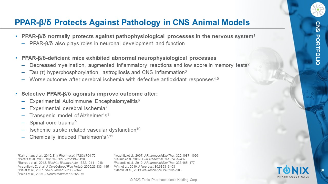 © 2023 Tonix Pharmaceuticals Holding Corp. 29 © 2023 Tonix Pharmaceuticals Holding Corp. CNS PORTFOLIO Peroxisome Proliferator Activated - Receptor (PPAR) Family: PPAR - β/δ Emw . Wikimedia Commons . February 10, 2010. Accessed March 31, 2022. https://commons.wikimedia.org/wiki/File:Protein_PPARA_PDB_1i7g.png Emw . Wikimedia Commons . December 15, 2009. Accessed March 31, 2022. https://commons.wikimedia.org/wiki/File:Protein_PPARD_PDB_1gwx.png A2 - 33. Wikimedia Commons . March 14, 2012. Accessed March 31, 2022. https://commons.wikimedia.org/wiki/File:PPARG.png Expression Liver, muscle, heart Known roles FA oxidation Expression Brain, skeletal muscle, adipose tissue, microglia, lungs, skin Known roles Promotes CNS neurotrophic factors and reduces expression of inflammatory mediators Expression Endothelial and smooth muscle cells Known roles Adipocyte differentiation regulation, FA storage, glucose metabolism PPAR - α 1 PPAR - β/δ 1,2 PPAR - γ 1 1 Tyagi et al., 2011. J Adv Pharm Technol Res . 2(4):236 - 240 2 D’Angelo et al., 2011. J Cell Physiol. 226(8):2170 - 2180