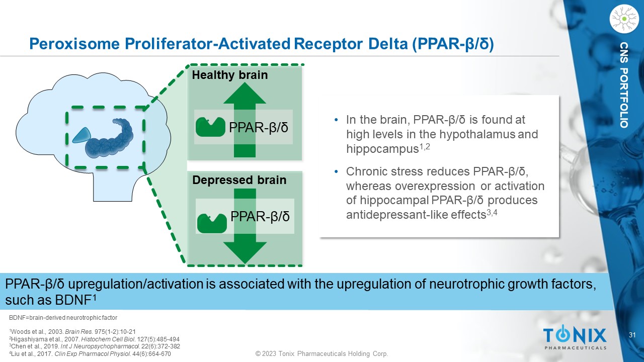 © 2023 Tonix Pharmaceuticals Holding Corp. 30 © 2023 Tonix Pharmaceuticals Holding Corp. CNS PORTFOLIO PPAR - β / δ Protects Against Pathology in CNS Animal Models • PPAR - β /δ normally protects against pathophysiological processes in the nervous system 1 ‒ PPAR - β /δ also plays roles in neuronal development and function • PPAR - β /δ - deficient mice exhibited abnormal neurophysiological processes ‒ Decreased myelination, augmented inflammatory reactions and low score in memory tests 2 ‒ Tau (τ) hyperphosphorylation, astrogliosis and CNS inflammation 3 ‒ Worse outcome after cerebral ischemia with defective antioxidant responses 4,5 • Selective PPAR - β /δ agonists improve outcome after: ‒ Experimental Autoimmune Encephalomyelitis 6 ‒ Experimental cerebral ischemia 7 ‒ Transgenic model of Alzheimer’s 8 ‒ Spinal cord trauma 9 ‒ Ischemic stroke related vascular dysfunction 10 ‒ Chemically induced Parkinson’s 7,11 1 Kahremany et al., 2015. Br J Pharmacol . 172(3):754 - 70 2 Peters et al., 2000. Mol Cell Biol. 20:5119 – 5128 3 Barroso et al., 2013. Biochim Biophys Acta. 1832:1241 – 1248 4 Arsenijevic D, et al. J Cereb Blood Flow Metab . 2006;26:433 – 445 5 Pialat et al., 2007. NMR Biomed. 20:335 – 342 6 Polak et al., 2005. J Neuroimmunol . 168:65 – 75 7 Iwashita et al., 2007. J Pharmacol Exp Ther . 320:1087 – 1096 8 Kalinin et al., 2009. Curr Alzheimer Res. 6:431 – 437 9 Paterniti et al., 2010. J Pharmacol Exp Ther . 333:465 – 477 10 Yin et al., 2010. J Neurosci . 30:6398 – 6408 11 Martin et al., 2013. Neuroscience. 240:191 – 203
