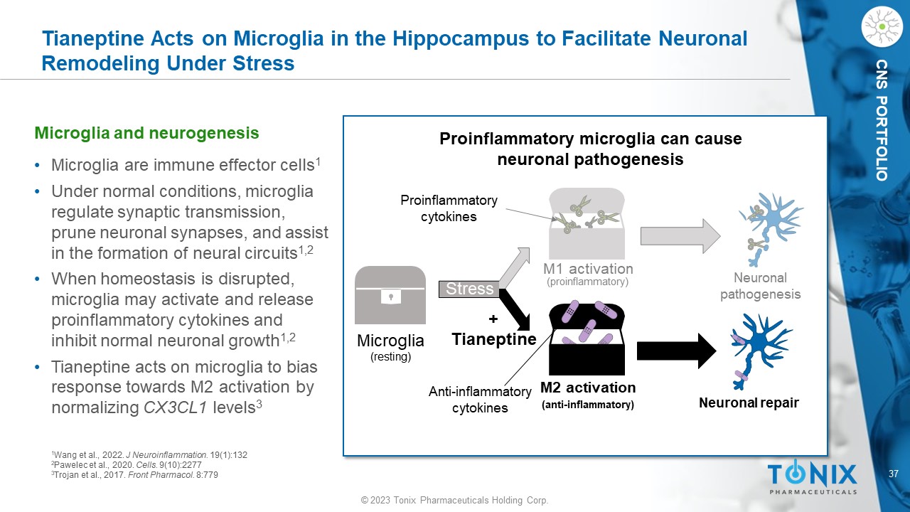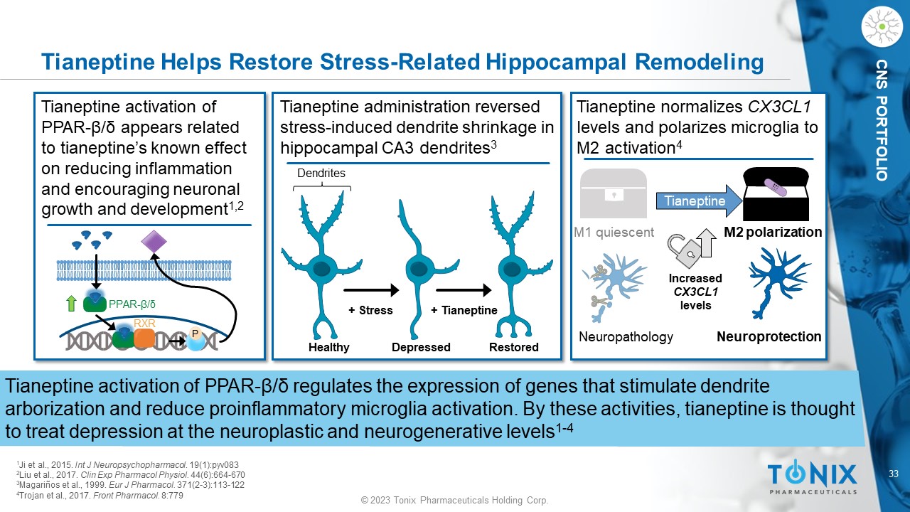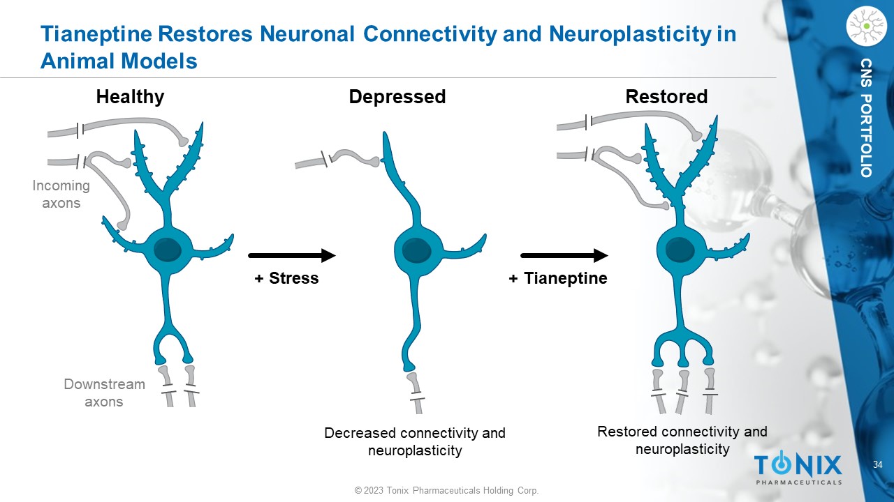 © 2023 Tonix Pharmaceuticals Holding Corp. 33 © 2023 Tonix Pharmaceuticals Holding Corp. CNS PORTFOLIO Tianeptine Helps Restore Stress - Related Hippocampal Remodeling Tianeptine activation of PPAR - β / δ regulates the expression of genes that stimulate dendrite arborization and reduce proinflammatory microglia activation. By these activities, tianeptine is thought to treat depression at the neuroplastic and neurogenerative levels 1 - 4 Tianeptine administration reversed stress - induced dendrite shrinkage in hippocampal CA3 dendrites 3 Restored Healthy Tianeptine activation of PPAR - β/δ appears related to tianeptine’s known effect on reducing inflammation and encouraging neuronal growth and development 1,2 P Depressed Dendrites PPAR - β/δ RXR + Stress + Tianeptine Tianeptine normalizes CX3CL1 levels and polarizes microglia to M2 activation 4 Increased CX3CL1 levels Tianeptine M1 quiescent Neuroprotection Neuropathology M2 polarization 1 Ji et al., 2015. Int J Neuropsychopharmacol . 19(1):pyv083 2 Liu et al., 2017. Clin Exp Pharmacol Physiol. 44(6):664 - 670 3 Magariños et al., 1999. Eur J Pharmacol . 371(2 - 3):113 - 122 4 Trojan et al., 2017. Front Pharmacol . 8:779