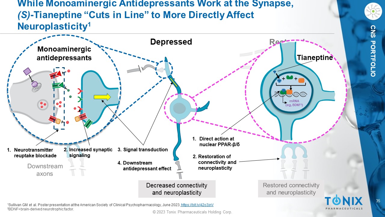 © 2023 Tonix Pharmaceuticals Holding Corp. 35 © 2023 Tonix Pharmaceuticals Holding Corp. CNS PORTFOLIO While Monoaminergic Antidepressants Work at the Synapse, (S) - Tianeptine “Cuts in Line” to More Directly Affect Neuroplasticity 1 Depressed Decreased connectivity and neuroplasticity Tianeptine + + mRNA ( eg , BDNF 2 ) 1 Sullivan GM et al. Poster presentation at the American Society of Clinical Psychopharmacology, June 2023. https://bit.ly/42o3jnV 2 BDNF=brain - derived neurotrophic factor. Monoaminergic antidepressants 1. Neurotransmitter reuptake blockade 1. Direct action at nuclear PPAR - β/δ 2. Increased synaptic signaling 3. Signal transduction 4. Downstream antidepressant effect 2. Restoration of connectivity and neuroplasticity