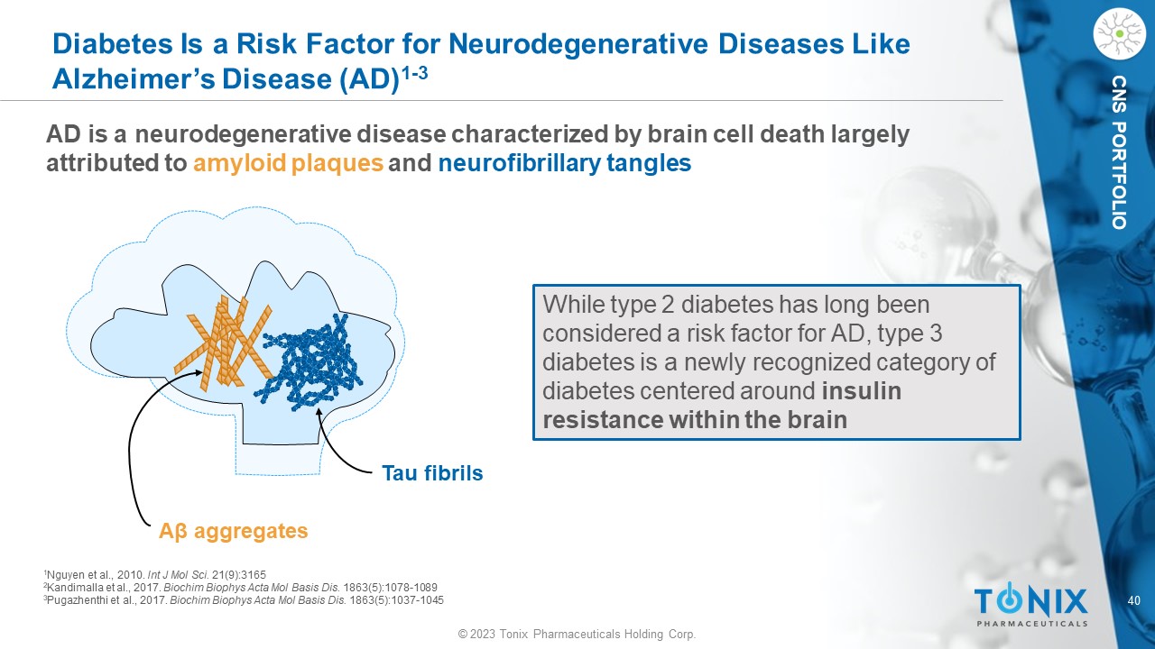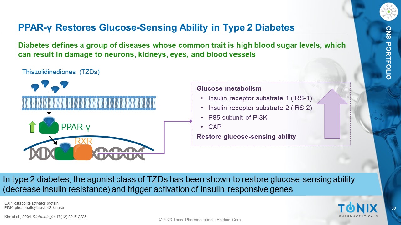 © 2023 Tonix Pharmaceuticals Holding Corp. 39 © 2023 Tonix Pharmaceuticals Holding Corp. CNS PORTFOLIO Glucose metabolism • Insulin receptor substrate 1 (IRS - 1) • Insulin receptor substrate 2 (IRS - 2) • P85 subunit of PI3K • CAP Restore glucose - sensing ability PPAR - γ Restores Glucose - Sensing Ability in Type 2 Diabetes CAP=catabolite activator protein PI3K=phosphatidylinositol 3 - kinase Kim et al., 2004. Diabetologia . 47(12):2215 - 2225 Diabetes defines a group of diseases whose common trait is high blood sugar levels, which can result in damage to neurons, kidneys, eyes, and blood vessels In type 2 diabetes, the agonist class of TZDs has been shown to restore glucose - sensing ability (decrease insulin resistance) and trigger activation of insulin - responsive genes PPAR - γ RXR Thiazolidinediones ( TZDs )