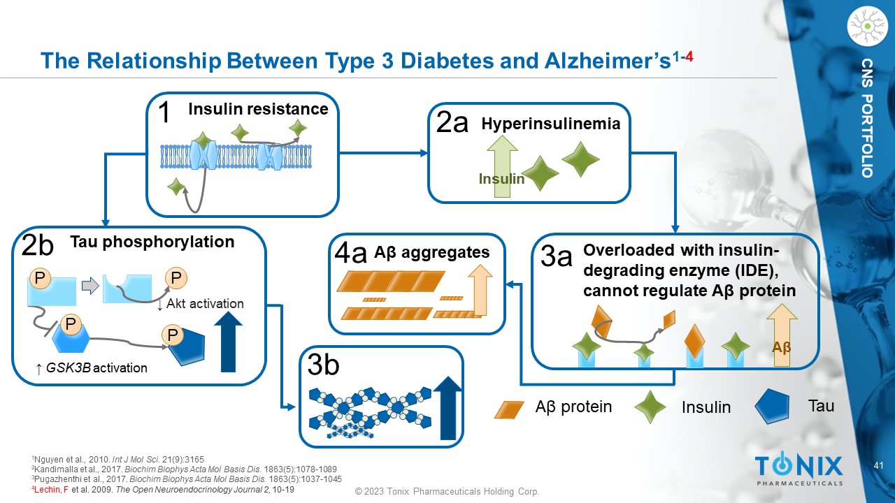 © 2023 Tonix Pharmaceuticals Holding Corp. 40 © 2023 Tonix Pharmaceuticals Holding Corp. CNS PORTFOLIO Diabetes Is a Risk Factor for Neurodegenerative Diseases Like Alzheimer’s Disease (AD) 1 - 3 AD is a neurodegenerative disease characterized by brain cell death largely attributed to amyloid plaques and neurofibrillary tangles While type 2 diabetes has long been considered a risk factor for AD, type 3 diabetes is a newly recognized category of diabetes centered around insulin resistance within the brain Tau fibrils A β aggregates 1 Nguyen et al., 2010. Int J Mol Sci. 21(9):3165 2 Kandimalla et al., 2017. Biochim Biophys Acta Mol Basis Dis. 1863(5):1078 - 1089 3 Pugazhenthi et al., 2017. Biochim Biophys Acta Mol Basis Dis. 1863(5):1037 - 1045