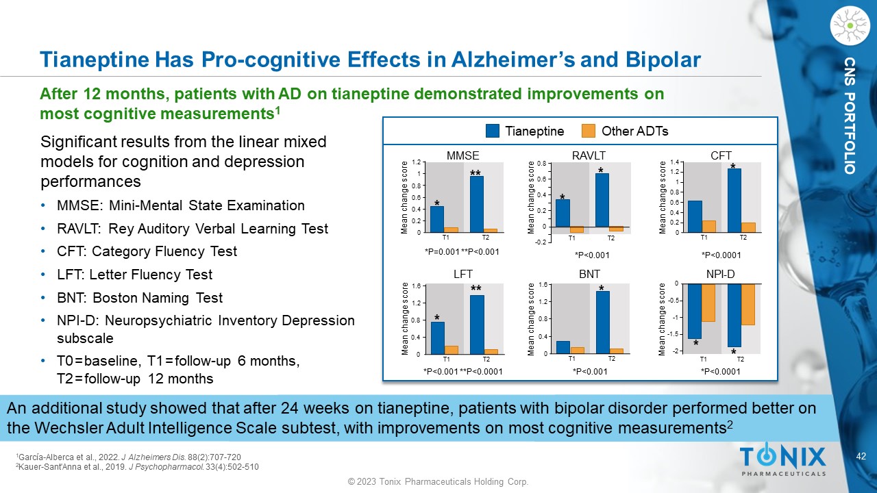 © 2023 Tonix Pharmaceuticals Holding Corp. 42 © 2023 Tonix Pharmaceuticals Holding Corp. CNS PORTFOLIO Tianeptine Has Pro - cognitive Effects in Alzheimer’s and Bipolar After 12 months, patients with AD on tianeptine demonstrated improvements on most cognitive measurements 1 1 García - Alberca et al., 2022. J Alzheimers Dis. 88(2):707 - 720 2 Kauer - Sant'Anna et al., 2019. J Psychopharmacol . 33(4):502 - 510 Significant results from the linear mixed models for cognition and depression performances • MMSE: Mini - Mental State Examination • RAVLT: Rey Auditory Verbal Learning Test • CFT: Category Fluency Test • LFT: Letter Fluency Test • BNT: Boston Naming Test • NPI - D: Neuropsychiatric Inventory Depression subscale • T0 = baseline, T1 = follow - up 6 months, T2 = follow - up 12 months An additional study showed that after 24 weeks on tianeptine, patients with bipolar disorder performed better on the Wechsler Adult Intelligence Scale subtest, with improvements on most cognitive measurements 2 Tianeptine Other ADTs 1.2 0.8 1 0.6 0.4 0.2 0 MMSE T1 T2 Mean change score * ** *P=0.001 **P<0.001 0.8 0.4 0.6 0.2 0 - 0.2 RAVLT T1 T2 Mean change score * * 1.2 0.8 1 0.6 0.4 0.2 0 CFT T1 T2 Mean change score * 1.4 Mean change score 1.2 0.8 0.4 0 LFT T1 T2 * ** 1.6 1.6 0.8 1.2 0 0.4 Mean change score BNT T1 T2 * Mean change score 0 - 0.5 - 1 - 1.5 - 2 NPI - D T1 T2 * * *P<0.001 *P<0.0001 *P<0.001 **P<0.0001 *P<0.001 *P<0.0001