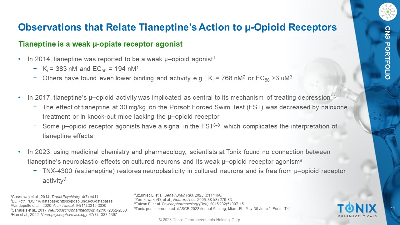 © 2023 Tonix Pharmaceuticals Holding Corp. 44 © 2023 Tonix Pharmaceuticals Holding Corp. CNS PORTFOLIO Observations that Relate Tianeptine’s Action to µ - Opioid Receptors • In 2014, tianeptine was reported to be a weak µ – opioid agonist 1 − K i = 383 nM and EC 50 = 194 nM 1 − Others have found even lower binding and activity, e.g., K i = 768 nM 2 or EC 50 >3 uM 3 • In 2017, tianeptine’s µ – opioid activity was implicated as central to its mechanism of treating depression 4,5 − The effect of tianeptine at 30 mg/kg on the Porsolt Forced Swim Test (FST) was decreased by naloxone treatment or in knock - out mice lacking the µ – opioid receptor − Some µ – opioid receptor agonists have a signal in the FST 6 - 8 , which complicates the interpretation of tianeptine effects • In 2023, using medicinal chemistry and pharmacology, scientists at Tonix found no connection between tianeptine’s neuroplastic effects on cultured neurons and its weak µ – opioid receptor agonism 9 − TNX - 4300 ( estianeptine ) restores neuroplasticity in cultured neurons and is free from µ – opioid receptor activity 9 1 Gassaway et al., 2014. Transl Psychiatry . 4(7):e411 2 BL Roth PDSP K i database; https://pdsp.unc.edu/databases 3 Vandeputte et al., 2020. Arch Toxicol . 94(11):3819 - 3830 4 Samuels et al., 2017. Neuropsychopharmacology . 42(10):2052 - 2063 5 Han et al., 2022. Neuropsychopharmacology . 47(7):1387 - 1397 Tianeptine is a weak µ - opiate receptor agonist 6 Szumiec L, et al. Behav Brain Res. 2023. 3:114466. 7 Zomkowski AD, et al., Neurosci Lett. 2005. 381(3):279 - 83. 8 Falcon E, et al. Psychopharmacology ( Berl ). 2015 232(5):907 - 15. 9 Tonix poster presented at ASCP 2023 Annual Meeting, Miami FL, May 30 - June 2, Poster T41