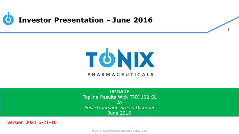 1 UPDATE Topline Results With TNX - 102 SL In Post - Traumatic Stress Disorder June 2016 Version 0021 6 - 21 - 16 Investor Presentation - June 2016 © 2016 Tonix Pharmaceuticals Holding Corp