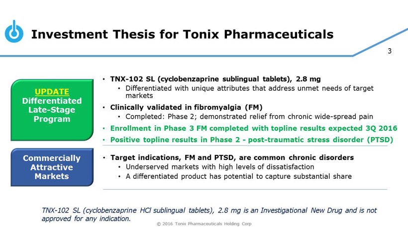 2 © 2016 Tonix Pharmaceuticals Holding Corp Cautionary Note on Forward - Looking Statements Certain statements in this presentation regarding strategic plans, expectations and objectives for future operations or results are “forward - looking statements” as defined by the Private Securities Litigation Reform Act of 1995 . These statements may be identified by the use of forward - looking words such as “anticipate,” “believe,” “forecast,” “estimate” and “intend,” among others . These forward - looking statements are based on Tonix’s current expectations and actual results could differ materially . There are a number of factors that could cause actual events to differ materially from those indicated by such forward - looking statements . These factors include, but are not limited to, substantial competition ; our possible need for additional financing ; uncertainties of patent protection and litigation ; uncertainties of government or third party payor reimbursement ; limited research and development efforts and dependence upon third parties ; and risks related to failure to obtain U . S Food and Drug Administration clearances or approvals and noncompliance with its regulations . As with any pharmaceutical under development, there are significant risks in the development, regulatory approval and commercialization of new products . The forward - looking statements in this presentation are made as of the date of this presentation, even if subsequently made available by the Company on its website or otherwise . Tonix does not undertake an obligation to update or revise any forward - looking statement, except as required by law . Investors should read the risk factors set forth in the Annual Report on Form 10 - K for the year ended December 31 , 2015 , as filed with the Securities and Exchange Commission (the “SEC”) on March 3 , 2016 , and future periodic reports filed with the SEC on or after the date hereof . All of the Company's forward - looking statements are expressly qualified by all such risk factors and other cautionary statements .