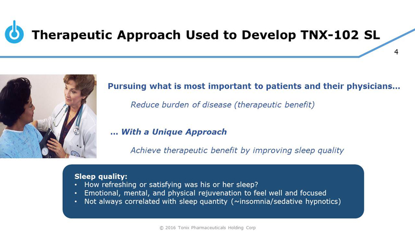 3 © 2016 Tonix Pharmaceuticals Holding Corp Investment Thesis for Tonix Pharmaceuticals UPDATE Differentiated Late - Stage Program Commercially Attractive Markets • TNX - 102 SL (cyclobenzaprine sublingual tablets), 2.8 mg • Differentiated with unique attributes that address unmet needs of target markets • Clinically validated in fibromyalgia (FM) • Completed: Phase 2; demonstrated relief from chronic wide - spread pain • Enrollment in Phase 3 FM completed with topline results expected 3Q 2016 • Positive topline results in Phase 2 - post - traumatic stress disorder (PTSD) • Target indications, FM and PTSD, are common chronic disorders • Underserved markets with high levels of dissatisfaction • A differentiated product has potential to capture substantial share TNX - 102 SL (cyclobenzaprine HCl sublingual tablets), 2.8 mg is an Investigational New Drug and is not approved for any indication. © 2016 Tonix Pharmaceuticals Holding Corp