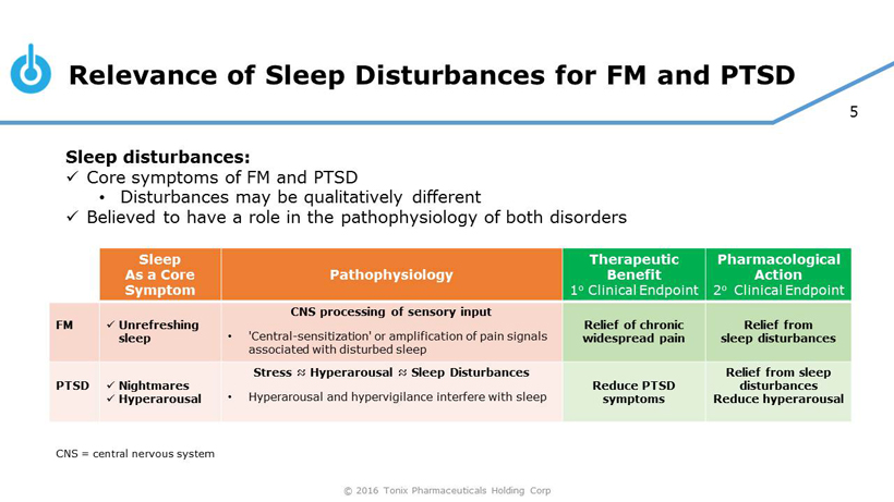 4 © 2016 Tonix Pharmaceuticals Holding Corp Therapeutic Approach Used to Develop TNX - 102 SL Sleep quality: • How refreshing or satisfying was his or her sleep? • Emotional , mental, and physical rejuvenation to feel well and focused • Not always correlated with sleep quantity ( ~ insomnia/sedative hypnotics) Pursuing what is most important to patients and their physicians… Reduce burden of disease ( therapeutic benefit ) … With a Unique Approach Achieve therapeutic benefit by improving sleep quality