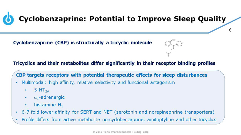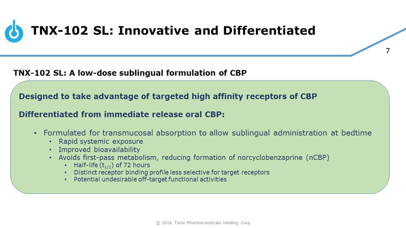 6 © 2016 Tonix Pharmaceuticals Holding Corp CBP targets receptors with potential therapeutic effects for sleep disturbances • Multimodal: high affinity, relative selectivity and functional antagonism • 5 - HT 2A • a 1 - adrenergic • histamine H 1 • 6 - 7 fold lower affinity for SERT and NET (serotonin and norepinephrine transporters) • Profile differs from active metabolite norcyclobenzaprine, amitriptyline and other tricyclics Cyclobenzaprine: Potential t o Improve Sleep Quality Cyclobenzaprine (CBP) is structurally a tricyclic molecule Tricyclics and their metabolites differ significantly in their receptor binding profiles