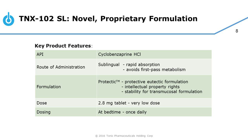 7 © 2016 Tonix Pharmaceuticals Holding Corp Designed to take advantage of targeted high affinity receptors of CBP Differentiated from immediate release oral CBP : • Formulated for transmucosal absorption to allow sublingual administration at bedtime • Rapid systemic exposure • Improved bioavailability • Avoids first - pass metabolism, reducing formation of norcyclobenzaprine (nCBP) • Half - life (t 1/2 ) of 72 hours • Distinct receptor binding profile less selective for target receptors • Potential undesirable off - target functional activities TNX - 102 SL: Innovative and Differentiated TNX - 102 SL: A low - dose sublingual formulation of CBP