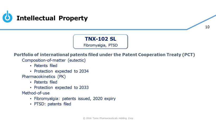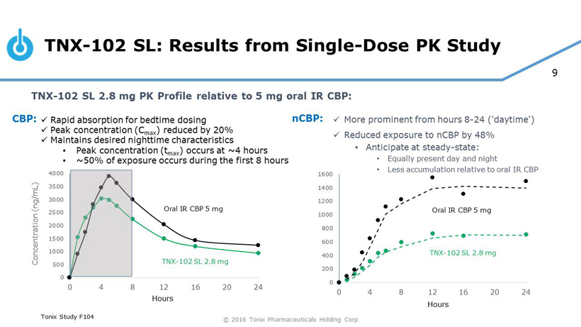 8 © 2016 Tonix Pharmaceuticals Holding Corp TNX - 102 SL : Novel, Proprietary Formulation API Cyclobenzaprine HCl Route of Administration Sublingual - rapid absorption - avoids first - pass metabolism Formulation Protectic TM - protective eutectic formulation - intellectual property rights - stability for transmucosal formulation Dose 2.8 mg tablet - very low dose Dosing At bedtime - once daily Key Product Features :