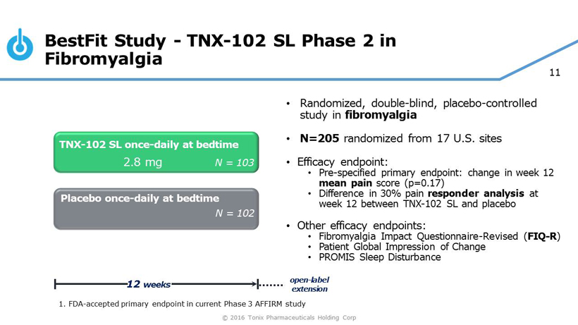 10 © 2016 Tonix Pharmaceuticals Holding Corp Intellectual P roperty Portfolio of international patents filed under the Patent Cooperation Treaty (PCT ) C omposition - of - matter (eutectic) • Patents filed • Protection expected to 2034 Pharmacokinetics (PK) • Patents filed • Protection expected to 2033 Method - of - use • Fibromyalgia: patents issued, 2020 expiry • PTSD: patents filed TNX - 102 SL Fibromyalgia , PTSD
