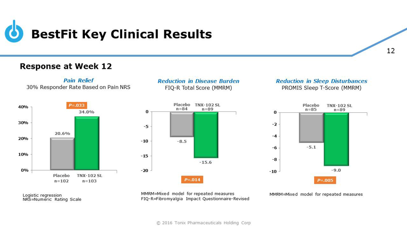 11 © 2016 Tonix Pharmaceuticals Holding Corp BestFit Study - TNX - 102 SL Phase 2 in Fibromyalgia Placebo once - daily at bedtime 12 weeks TNX - 102 SL once - daily at bedtime N = 102 N = 103 2.8 mg open - label extension 1. FDA - accepted primary endpoint in current Phase 3 AFFIRM study • Randomized, double - blind, placebo - controlled study in fibromyalgia • N=205 randomized from 17 U.S. sites • Efficacy endpoint: • Pre - specified primary endpoint: change in week 12 mean pain score (p=0.17) • Difference in 30% pain responder analysis at week 12 between TNX - 102 SL and placebo • Other efficacy endpoints: • Fibromyalgia Impact Questionnaire - Revised ( FIQ - R ) • Patient Global Impression of Change • PROMIS Sleep Disturbance