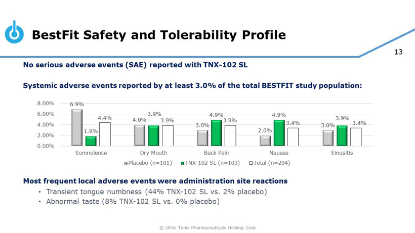 12 © 2016 Tonix Pharmaceuticals Holding Corp BestFit Key Clinical Results 20.6% 34.0% 0% 10% 20% 30% 40% Pain Relief 30 % Responder Rate Based on Pain NRS Placebo n=102 TNX - 102 SL n=103 P =.033 Logistic regression NRS=Numeric Rating Scale Placebo n =85 TNX - 102 SL n=89 P =.005 - 5.1 - 9.0 -10 -8 -6 -4 -2 0 Reduction in Sleep Disturbances PROMIS Sleep T - Score (MMRM) MMRM=Mixed model for repeated measures FIQ - R=Fibromyalgia Impact Questionnaire - Revised Placebo n =84 TNX - 102 SL n=89 P =. 014 - 8.5 - 15.6 -20 -15 -10 -5 0 Reduction in Disease Burden FIQ - R Total Score (MMRM) Response at Week 12 MMRM=Mixed model for repeated measures