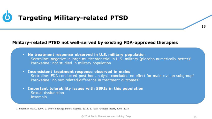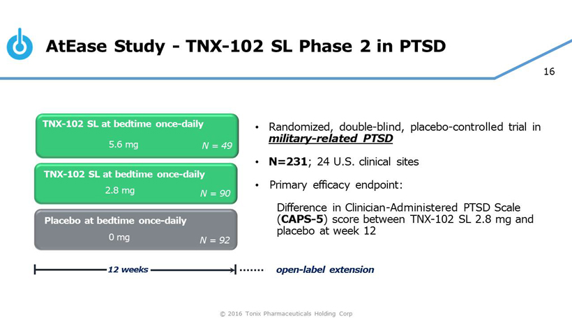 15 © 2016 Tonix Pharmaceuticals Holding Corp Targeting Military - related PTSD 15 1. Friedman et al., 2007, 2. Zoloft Package Insert, August, 2014, 3. Paxil Package Insert, June, 2014 Military - related PTSD not well - served by existing FDA - approved therapies • No treatment response observed in U.S. military populatio n Sertraline: negative in large multicenter trial in U.S. military (placebo numerically better) 1 Paroxetine: not studied in military population • Inconsistent treatment response observed in males Sertraline: FDA conducted post - hoc analysis concluded no effect for male civilian subgroup 2 Paroxetine: no sex - related difference in treatment outcomes 3 • Important tolerability issues with SSRIs in this population Sexual dysfunction Insomnia © 2016 Tonix Pharmaceuticals Holding Corp