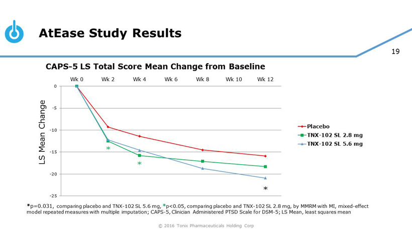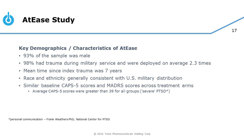 16 © 2016 Tonix Pharmaceuticals Holding Corp AtEase Study - TNX - 102 SL Phase 2 in PTSD • Randomized, double - blind, placebo - controlled trial in military - related PTSD • N=231 ; 24 U.S. clinical sites • Primary efficacy endpoint: D ifference in Clinician - Administered PTSD Scale ( CAPS - 5 ) score between TNX - 102 SL 2.8 mg and placebo at week 12 Placebo at bedtime once - daily 12 weeks N = 92 TNX - 102 SL at bedtime once - daily N = 90 2.8 mg open - label extension 0 mg TNX - 102 SL at bedtime once - daily N = 49 5.6 mg