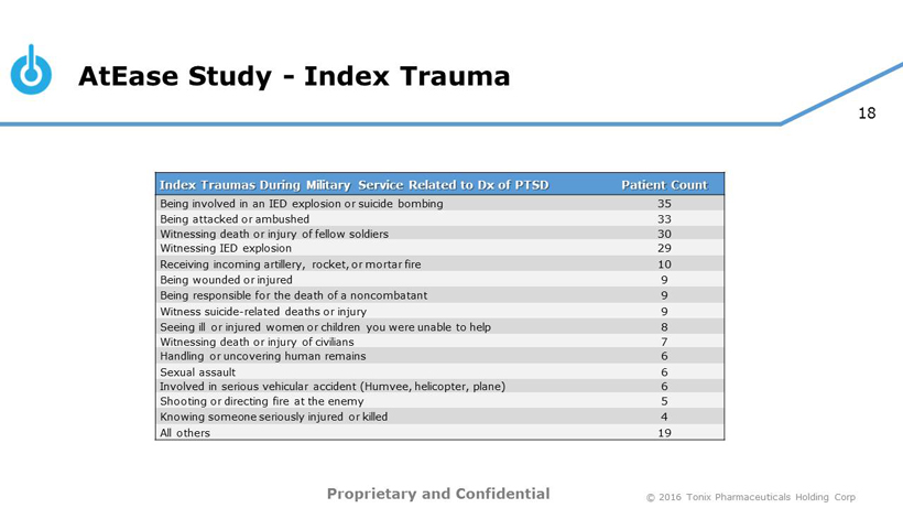 17 © 2016 Tonix Pharmaceuticals Holding Corp AtEase Study Key Demographics / Characteristics of AtEase • 93% of the sample was male • 98% had trauma during military service and were deployed on average 2.3 times • Mean time since index trauma was 7 years • Race and ethnicity generally consistent with U.S. military distribution • Similar baseline CAPS - 5 scores and MADRS scores across treatment arms • Average CAPS - 5 scores were greater than 39 for all groups ('severe' PTSD*) *personal communication – Frank Weathers PhD, National Center for PTSD © 2016 Tonix Pharmaceuticals Holding Corp