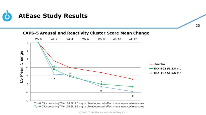19 © 2016 Tonix Pharmaceuticals Holding Corp AtEase Study Results -25 -20 -15 -10 -5 0 Wk 0 Wk 2 Wk 4 Wk 6 Wk 8 Wk 10 Wk 12 Placebo TNX-102 SL 2.8 mg TNX-102 SL 5.6 mg * * p=0.031 , comparing placebo and TNX - 102 SL 5.6 mg, * p<0.05, comparing placebo and TNX - 102 SL 2.8 mg, by MMRM with MI, mixed - effect model repeated measures with multiple imputation; CAPS - 5 , Clinician Administered PTSD Scale for DSM - 5; LS Mean, least squares mean LS Mean Change * * CAPS - 5 LS Total Score Mean Change from Baseline