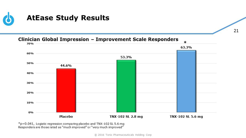 20 © 2016 Tonix Pharmaceuticals Holding Corp AtEase Study Results -7 -6 -5 -4 -3 -2 -1 0 Wk 0 Wk 2 Wk 4 Wk 6 Wk 8 Wk 10 Wk 12 Placebo TNX-102 SL 2.8 mg TNX-102 SL 5.6 mg * * * * * * LS Mean Change * p<0.05, comparing TNX - 102 SL 5.6 mg to placebo, mixed - effect model repeated measures * p<0.05, comparing TNX - 102 SL 2.8 mg to placebo, mixed - effect model repeated measures CAPS - 5 Arousal and Reactivity Cluster Score Mean Change