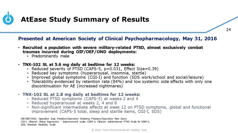 23 © 2016 Tonix Pharmaceuticals Holding Corp AtEase Study Results Adverse Events (≥5% rate in any group) Preferred Term Placebo N=94* TNX - 102 SL 2.8 mg N=93* TNX - 102 SL 5.6 mg N=50* Overall N=237* Local Administration Site Conditions Hypoaesthesia oral 2 ( 2.1%) 36 (38.7%) 18 (36.0%) 54 (37.8%) Paraesthesia oral 3 ( 3.2%) 15 (16.1%) 2 ( 4.0%) 17 (11.9%) Glossodynia 1 ( 1.1%) 3 ( 3.2%) 3 ( 6.0%) 6 ( 4.2%) Systemic Adverse Events Somnolence 6 ( 6.4%) 11 (11.8%) 8 (16.0%) 19 (13.3%) Dry mouth 10 (10.6%) 4 ( 4.3%) 8 (16.0%) 12 ( 8.4%) Headache 4 ( 4.3%) 5 ( 5.4%) 6 (12.0%) 11 ( 7.7%) Insomnia 8 ( 8.5%) 7 ( 7.5%) 3 ( 6.0%) 10 ( 7.0%) Sedation 1 ( 1.1%) 2 ( 2.2%) 6 (12.0%) 8 ( 5.6%) Upper respiratory tract infection 5 ( 5.3%) 3 ( 3.2%) 2 ( 4.0%) 5 ( 3.5%) Abnormal dreams 5 ( 5.3%) 1 ( 1.1%) 1 ( 2.0%) 2 ( 1.4%) Weight increased 5 ( 5.3%) 1 ( 1.1%) 1 ( 2.0%) 2 ( 1.4%) Completer Rate: Placebo 73% TNX - 102 SL 2.8 mg 79% TNX - 102 SL 5.6 mg 84%