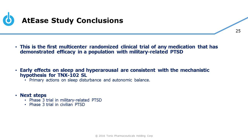 24 © 2016 Tonix Pharmaceuticals Holding Corp AtEase Study Summary of Results Presented at American Society of Clinical Psychopharmacology, May 31, 2016 • Recruited a population with severe military - related PTSD , almost exclusively combat traumas incurred during OIF/OEF/OND deployments: • Predominantly male • TNX - 102 SL at 5.6 mg daily at bedtime for 12 weeks: • Reduced severity of PTSD (CAPS - 5, p=0.031, Effect Size=0.39) • Reduced key symptoms (hyperarousal, insomnia, startle) • Improved global symptoms (CGI - I) and function (SDS work/school and social/leisure) • Tolerability evidenced by retention rate (84%) and low systemic side effects with only one discontinuation for AE (increased nightmares ) • TNX - 102 SL at 2.8 mg daily at bedtime for 12 weeks: • Reduced PTSD symptoms (CAPS - 5) at weeks 2 and 4 • Reduced hyperarousal at weeks 2, 4 and 8 • Non - significant intermediate effects at week 12 on PTSD symptoms, global and functional improvement (CAPS - 5 total, sleep and startle items, CGI - I, SDS) OIF/OEF/OND, Operation Iraqi Freedom/Operation Enduring Freedom/Operation New Dawn CGI - I, Clinician Global Impression – Improvement scale; CAPS - 5, Clinician Administered PTSD Scale for DSM - 5; SDS, Sheehan Disability Scale