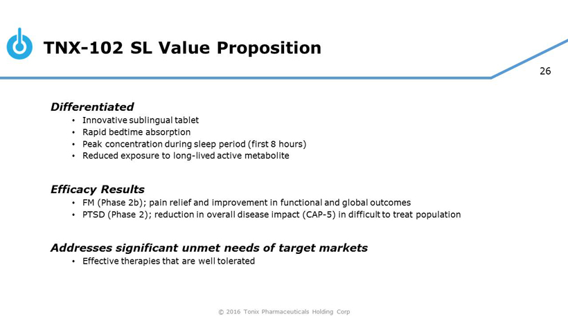 25 © 2016 Tonix Pharmaceuticals Holding Corp AtEase Study Conclusions • This is the first multicenter randomized clinical trial of any medication that has demonstrated efficacy in a population with military - related PTSD • Early effects on sleep and hyperarousal are consistent with the mechanistic hypothesis for TNX - 102 SL • P rimary actions on sleep disturbance and autonomic balance. • Next steps • Phase 3 trial in military - related PTSD • Phase 3 trial in civilian PTSD