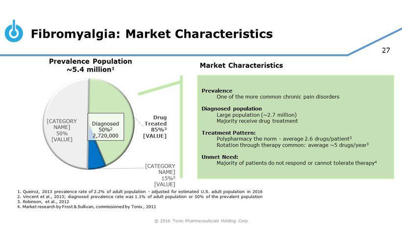26 © 2016 Tonix Pharmaceuticals Holding Corp TNX - 102 SL Value Proposition Differentiated • Innovative sublingual tablet • Rapid bedtime absorption • Peak concentration during sleep period (first 8 hours) • Reduced exposure to long - lived active metabolite Efficacy Results • FM (Phase 2b); pain relief and improvement in functional and global outcomes • PTSD (Phase 2); reduction in overall disease impact (CAP - 5) in difficult to treat population Addresses significant unmet needs of target markets • Effective therapies that are well tolerated