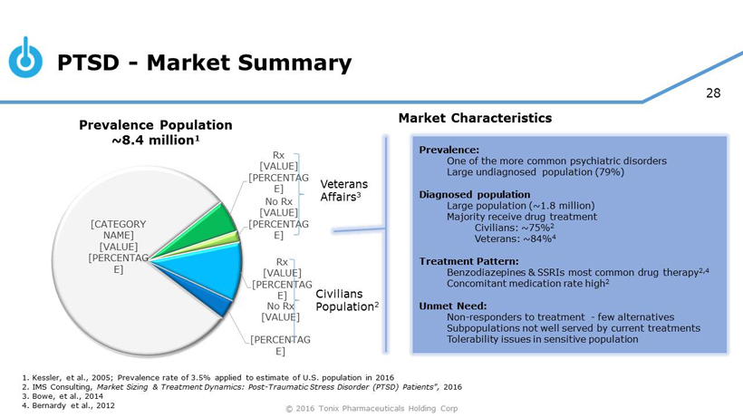 27 © 2016 Tonix Pharmaceuticals Holding Corp Fibromyalgia: Market Characteristics [CATEGORY NAME] 50% [VALUE] Drug Treated 85% 3 [VALUE] [CATEGORY NAME] 15% 3 [VALUE] Prevalence Population ~5.4 million 1 1. Queiroz , 2013 prevalence rate of 2.2% of adult population - adjusted for estimated U.S. adult population in 2016 2. Vincent et al., 2013; diagnosed prevalence rate was 1.1% of adult population or 50% of the prevalent population 3. Robinson, et al., 2012 4. Market research by Frost & Sullivan, commissioned by Tonix , 2011 Diagnosed 50% 2 2,720,000 Market Characteristics Prevalence One of the more common chronic pain disorders Diagnosed population Large population (~ 2.7 million) Majority receive drug treatment Treatment Pattern: Polypharmacy the norm - average 2.6 drugs/patient 3 Rotation through therapy common: average ~5 drugs/year 3 Unmet Need: Majority of patients do not respond or cannot tolerate therapy 4