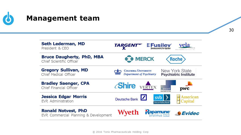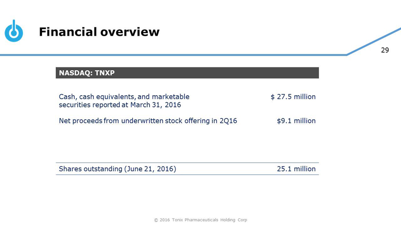 29 © 2016 Tonix Pharmaceuticals Holding Corp Financial overview NASDAQ: TNXP Cash, cash equivalents, and marketable securities reported at March 31, 2016 Net proceeds from underwritten stock offering in 2Q16 $ 27.5 million $9.1 million Shares outstanding (June 21, 2016) 25.1 million