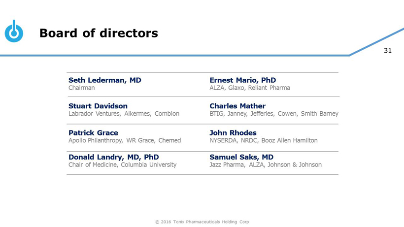 30 © 2016 Tonix Pharmaceuticals Holding Corp Management team Seth Lederman, MD President & CEO Jessica Edgar Morris EVP, Administration Bruce Daugherty, PhD, MBA Chief Scientific Officer Ronald Notvest, PhD EVP, Commercial Planning & Development Gregory Sullivan, MD Chief Medical Officer Bradley Saenger, CPA Chief Financial Officer