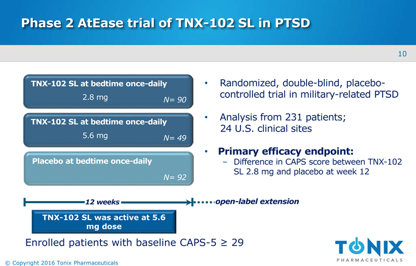 Phase 2 AtEase study of TNX-102 SL in PTSD AtEase Study Randomized, double-blind, placebo-controlled trial DSM-5 diagnostic criteria for PTSD 231* participants studied 2:1:2 at 24 U.S. sites1 x TNX-102 SL 2.8 mg tablet: 2 x TNX-102 SL 2.8 mg tablets: placebo Evaluated the Clinician Administered PTSD Scale for DSM-5 (CAPS-5) as primary endpointPre-specified primary analysis was 2.8 mg dose *Modified intent-to-treat (mITT) population 9 © Copyright 2016 Tonix Pharmaceuticals