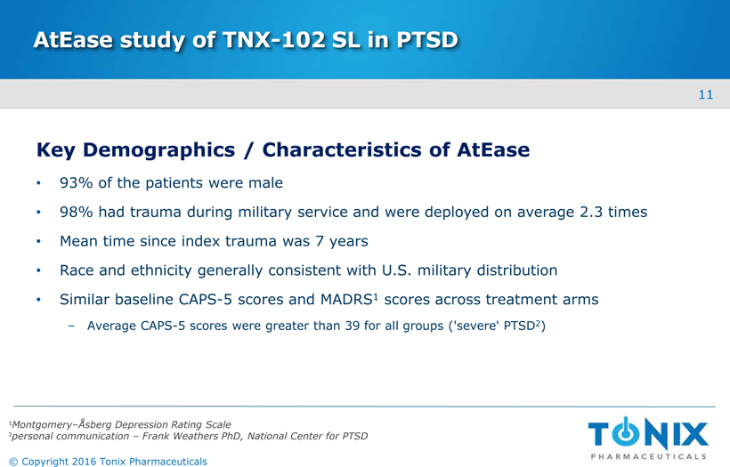 Phase 2 AtEase trial of TNX-102 SL in PTSD Randomized, double-blind, placebo-controlled trial in military-related PTSD Analysis from 231 patients; 24 U.S. clinical sites Primary efficacy endpoint:Difference in CAPS score between TNX-102 SL 2.8 mg and placebo at week 12 TNX-102 SL was active at 5.6 mg dose TNX-102 SL at bedtime once-daily Placebo at bedtime once-daily 12 weeks N= 90 TNX-102 SL at bedtime once-daily N= 92 N= 49 2.8 mg 5.6 mg open-label extension Enrolled patients with baseline CAPS-5 ≥ 29 10 © Copyright 2016 Tonix Pharmaceuticals