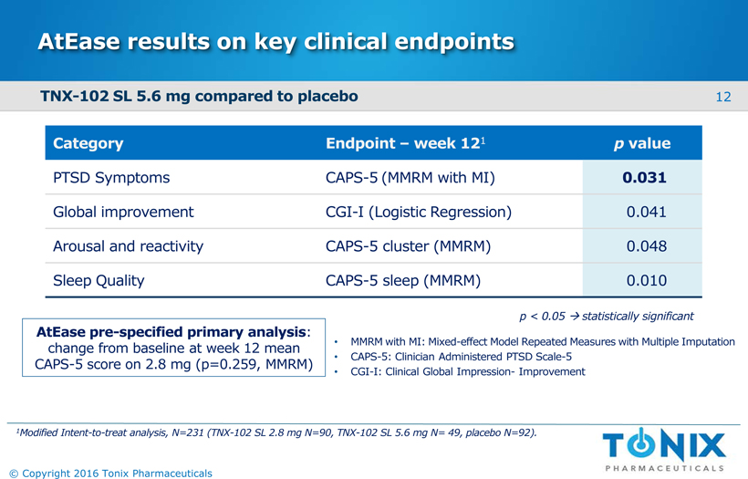 AtEasestudy of TNX-102 SL in PTSD Key Demographics / Characteristics of AtEase 93% of the patients were male 98% had trauma during military service and were deployed on average 2.3 times Mean time since index trauma was 7 years Race and ethnicity generally consistent with U.S. military distribution Similar baseline CAPS-5 scores and MADRS1scores across treatment armsAverage CAPS-5 scores were greater than 39 for all groups ('severe' PTSD2) 1Montgomery–ÅsbergDepression Rating Scale 2personal communication –Frank Weathers PhD, National Center for PTSD 11 © Copyright 2016 Tonix Pharmaceuticals