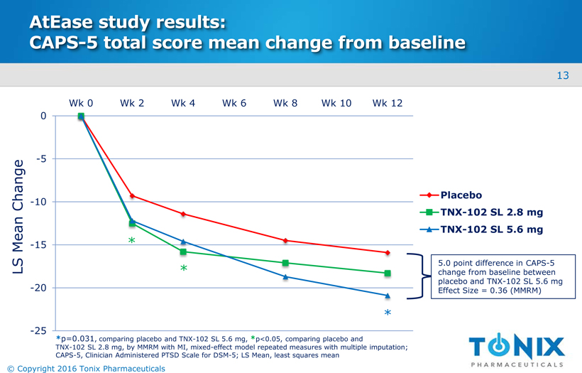 AtEaseresults on key clinical endpoints Category Endpoint –week 121 pvalue PTSD Symptoms CAPS-5(MMRM with MI) 0.031 Global improvement CGI-I (Logistic Regression) 0.041 Arousal and reactivity CAPS-5 cluster (MMRM) 0.048 Sleep Quality CAPS-5 sleep (MMRM) 0.010 12 © Copyright 2016 Tonix Pharmaceuticals