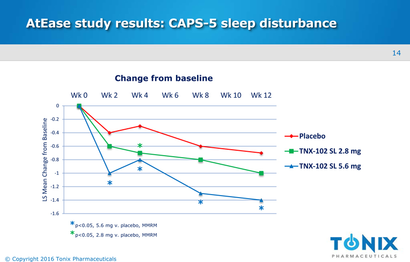 AtEasestudy results:CAPS-5 total score mean change from baseline -25 -20 -15 -10 -5 0 Wk 0 Wk 2 Wk 4 Wk 6 Wk 8 Wk 10 Wk 12 Placebo TNX-102 SL 2.8 mg TNX-102 SL 5.6 mg * *p=0.031, comparing placebo and TNX-102 SL 5.6 mg,*p<0.05, comparing placebo and TNX-102 SL 2.8 mg, by MMRM with MI, mixed-effect model repeated measures with multiple imputation; CAPS-5, Clinician Administered PTSD Scale for DSM-5; LS Mean, least squares mean LS Mean Change * * 5.0 point difference in CAPS-5 change from baseline between placebo and TNX-102 SL 5.6 mg Effect Size = 0.36 (MMRM) 13 © Copyright 2016 Tonix Pharmaceuticals
