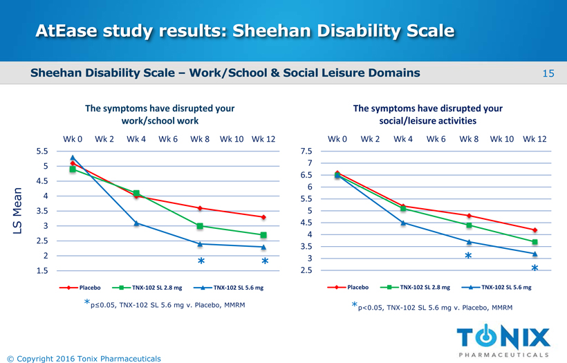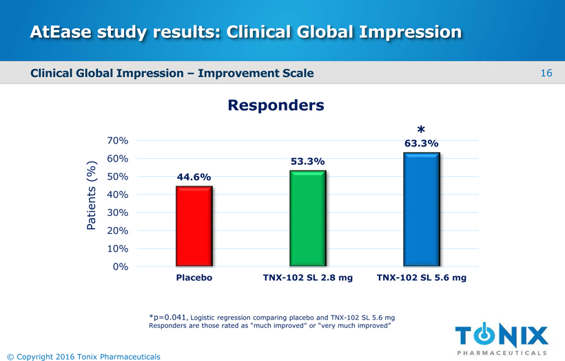 AtEasestudy results: Sheehan Disability Scale 1.5 2 2.5 3 3.5 4 4.5 5 5.5 Wk 0 Wk 2 Wk 4 Wk 6 Wk 8 Wk 10 Wk 12 The symptoms have disrupted your work/school work Placebo TNX-102 SL 2.8 mg TNX-102 SL 5.6 mg 2.5 3 3.5 4 4.5 5 5.5 6 6.5 7 7.5 Wk 0 Wk 2 Wk 4 Wk 6 Wk 8 Wk 10 Wk 12 The symptoms have disrupted your social/leisure activities Placebo TNX-102 SL 2.8 mg TNX-102 SL 5.6 mg * * * * *p≤0.05, TNX-102 SL 5.6 mg v. Placebo, MMRM *p<0.05, TNX-102 SL 5.6 mg v. Placebo, MMRM Sheehan Disability Scale –Work/School & Social Leisure Domains LS Mean 15 © Copyright 2016 Tonix Pharmaceuticals