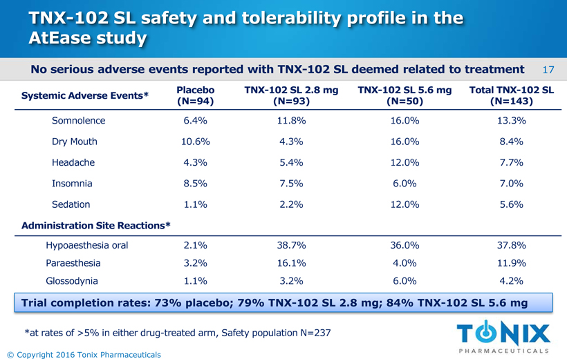 AtEasestudy results: Clinical Global Impression Clinical Global Impression –Improvement Scale Responders Patients (%) 44.6% 53.3% 63.3% 0% 10% 20% 30% 40% 50% 60% 70% Placebo TNX-102 SL 2.8 mg TNX-102 SL 5.6 mg *p=0.041, Logistic regression comparing placebo and TNX-102 SL 5.6 mg Responders are those rated as “much improved” or “very much improved” 16 © Copyright 2016 Tonix Pharmaceuticals