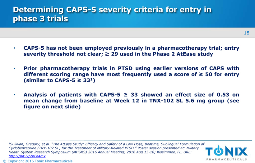 TNX-102 SL safety and tolerability profile in the AtEasestudy No serious adverse events reported with TNX-102 SL deemed related to treatment Systemic Adverse Events* Placebo(N=94) TNX-102 SL 2.8 mg(N=93) TNX-102 SL 5.6mg (N=50) Total TNX-102 SL(N=143) Somnolence 6.4% 11.8% 16.0% 13.3% DryMouth 10.6% 4.3% 16.0% 8.4% Headache 4.3% 5.4% 12.0% 7.7% Insomnia 8.5% 7.5% 6.0% 7.0% Sedation 1.1% 2.2% 12.0% 5.6% Administration Site Reactions* Hypoaesthesiaoral 2.1% 38.7% 36.0% 37.8% Paraesthesia 3.2% 16.1% 4.0% 11.9% Glossodynia 1.1% 3.2% 6.0% 4.2% 17 © Copyright 2016 Tonix Pharmaceuticals