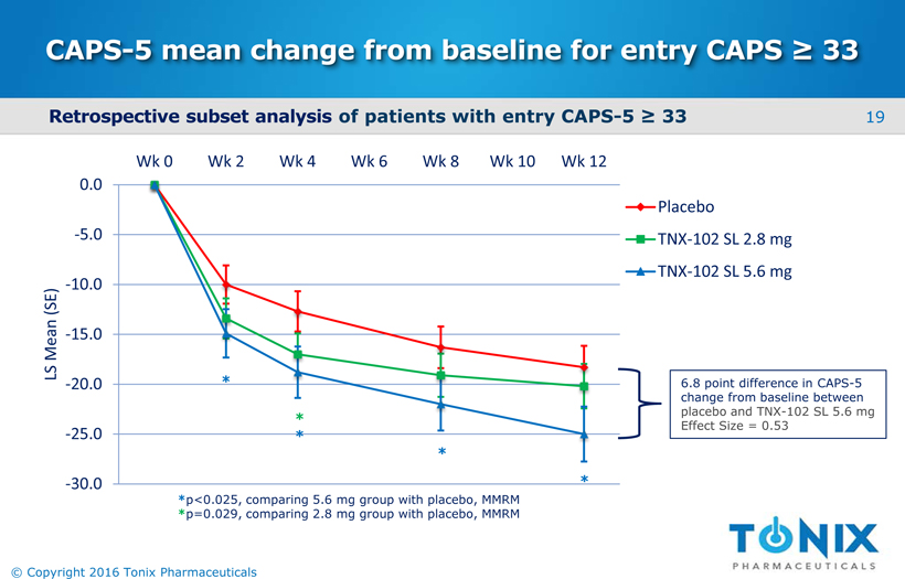 Determining CAPS-5 severity criteria for entry in phase 3 trials CAPS-5hasnotbeenemployedpreviouslyinapharmacotherapytrial;entryseveritythresholdnotclear;≥29usedinthePhase2AtEasestudy PriorpharmacotherapytrialsinPTSDusingearlierversionsofCAPSwithdifferentscoringrangehavemostfrequentlyusedascoreof≥50forentry(similartoCAPS-5≥331) AnalysisofpatientswithCAPS-5≥33showedaneffectsizeof0.53onmeanchangefrombaselineatWeek12inTNX-102SL5.6mggroup(seefigureonnextslide) 1Sullivan, Gregory, et al. “The AtEaseStudy: Efficacy and Safety of a Low Dose, Bedtime, Sublingual Formulation of Cyclobenzaprine (TNX-102 SL) for the Treatment of Military-Related PTSD.” Poster session presented at: Military Health System Research Symposium (MHSRS) 2016 Annual Meeting; 2016 Aug 15-18; Kissimmee, FL. URL: http://bit.ly/2bFo4mx 18 © Copyright 2016 Tonix Pharmaceuticals