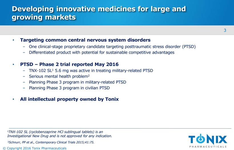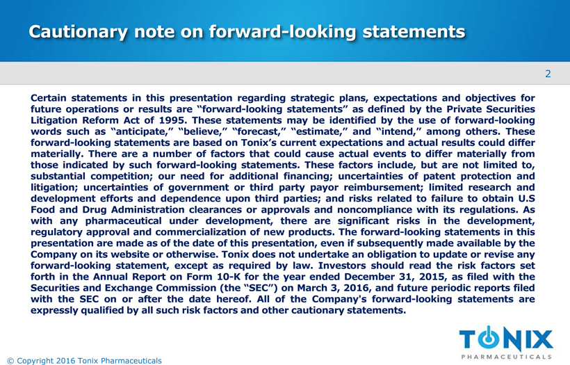 Cautionary note on forward-looking statements Certainstatementsinthispresentationregardingstrategicplans,expectationsandobjectivesforfutureoperationsorresultsare“forward-lookingstatements”asdefinedbythePrivateSecuritiesLitigationReformActof1995.Thesestatementsmaybeidentifiedbytheuseofforward-lookingwordssuchas“anticipate,”“believe,”“forecast,”“estimate,”and“intend,”amongothers.Theseforward-lookingstatementsarebasedonTonix’scurrentexpectationsandactualresultscoulddiffermaterially.Thereareanumberoffactorsthatcouldcauseactualeventstodiffermateriallyfromthoseindicatedbysuchforward-lookingstatements.Thesefactorsinclude,butarenotlimitedto,substantialcompetition;ourneedforadditionalfinancing;uncertaintiesofpatentprotectionandlitigation;uncertaintiesofgovernmentorthirdpartypayorreimbursement;limitedresearchanddevelopmenteffortsanddependenceuponthirdparties;andrisksrelatedtofailuretoobtainU.SFoodandDrugAdministrationclearancesorapprovalsandnoncompliancewithitsregulations.Aswithanypharmaceuticalunderdevelopment,therearesignificantrisksinthedevelopment,regulatoryapprovalandcommercializationofnewproducts.Theforward-lookingstatementsinthispresentationaremadeasofthedateofthispresentation,evenifsubsequentlymadeavailablebytheCompanyonitswebsiteorotherwise.Tonixdoesnotundertakeanobligationtoupdateorreviseanyforward-lookingstatement,exceptasrequiredbylaw.InvestorsshouldreadtheriskfactorssetforthintheAnnualReportonForm10-KfortheyearendedDecember31,2015,asfiledwiththeSecuritiesandExchangeCommission(the“SEC”)onMarch3,2016,andfutureperiodicreportsfiledwiththeSEConorafterthedatehereof.AlloftheCompany'sforward-lookingstatementsareexpresslyqualifiedbyallsuchriskfactorsandothercautionarystatements. 2 © Copyright 2016 Tonix Pharmaceuticals