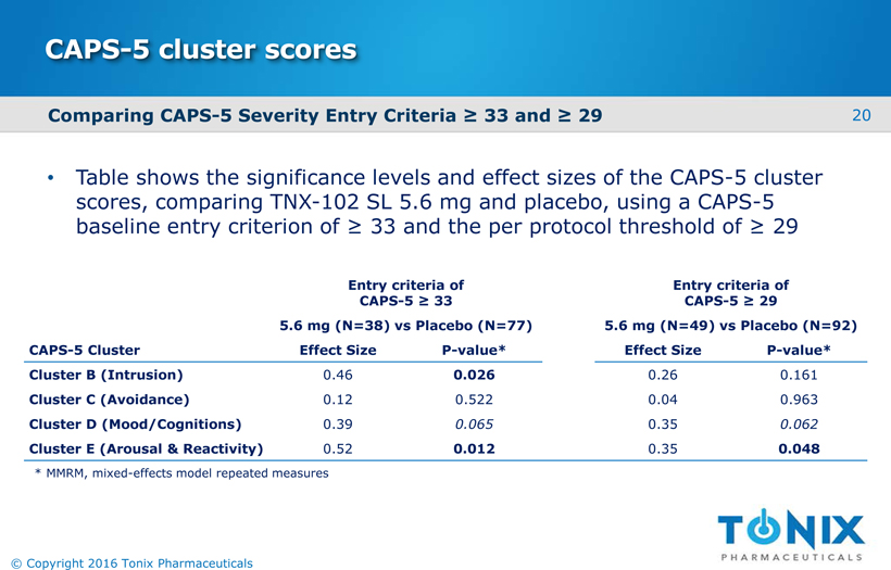 CAPS-5 mean change from baseline for entry CAPS ≥ 33 -30.0 -25.0 -20.0 -15.0 -10.0 -5.0 0.0 Wk 0 Wk 2 Wk 4 Wk 6 Wk 8 Wk 10 Wk 12 LS Mean (SE) Placebo TNX-102 SL 2.8 mg TNX-102 SL 5.6 mg 6.8 point difference in CAPS-5 change from baseline between placebo and TNX-102 SL 5.6 mg Effect Size = 0.53 * * * * * *p<0.025, comparing 5.6 mg group with placebo, MMRM *p=0.029, comparing 2.8 mg group with placebo, MMRM Retrospective subset analysisof patients with entry CAPS-5 ≥ 33 19 © Copyright 2016 Tonix Pharmaceuticals