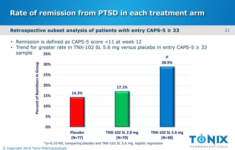 CAPS-5 cluster scores Table shows the significance levels and effect sizes of the CAPS-5 cluster scores, comparing TNX-102 SL 5.6 mg and placebo, using a CAPS-5 baseline entry criterion of ≥ 33 and the per protocol threshold of ≥ 29 Entry criteria of CAPS-5 ≥ 33 Entry criteria of CAPS-5 ≥ 29 5.6 mg (N=38) vs Placebo (N=77) 5.6 mg (N=49) vs Placebo (N=92) CAPS-5 Cluster Effect Size P-value* Effect Size P-value* Cluster B (Intrusion) 0.46 0.026 0.26 0.161 Cluster C (Avoidance) 0.12 0.522 0.04 0.963 Cluster D (Mood/Cognitions) 0.39 0.065 0.35 0.062 Cluster E (Arousal & Reactivity) 0.52 0.012 0.35 0.048 20 © Copyright 2016 Tonix Pharmaceuticals